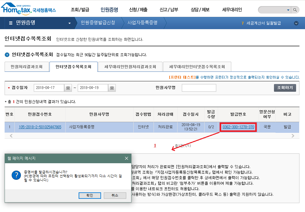 프린터가 있다면 인쇄하고, 없다면 PDF 파일로 변환하여 발급 받을 수 있습니다.